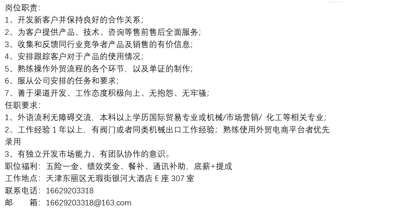 招聘信息---外貿業務員